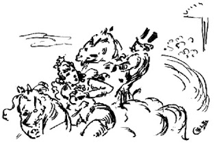 raivosos, vieram escarvar a arena, montados por mulheres e homens do circo. Não