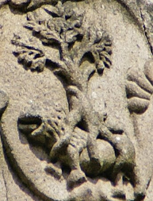 das representações heráldicas, mas sim deitado e subjugado pela oliveira, que